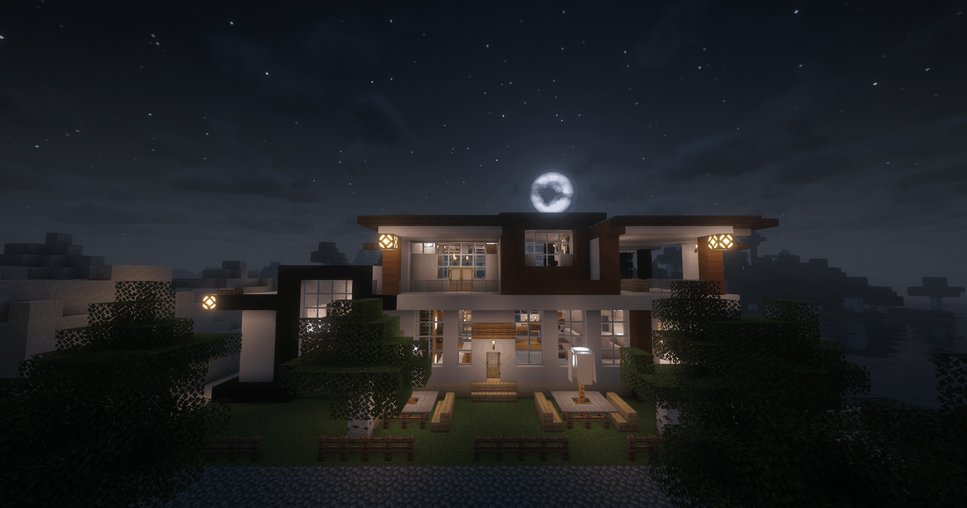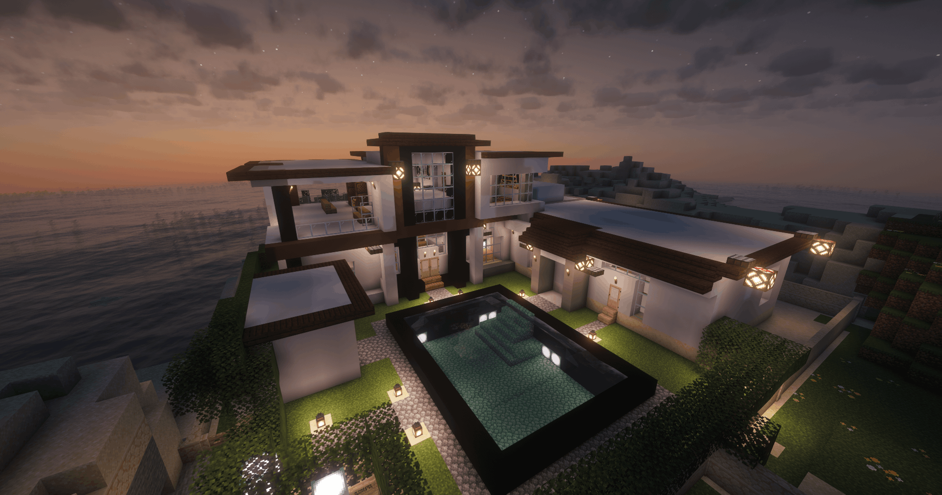 The New Andaman Beach Villa is a contemporary build in Minecraft Java Edition. Its primary materials are; white concrete, black concrete, brown concrete, and sandstone trim. There are also smart daylight-sensing lights on the exterior. It was completed in February 2026. After working on it for 6-8 weeks, I was able to finish it up with a second story (a major size increase over the original Unit 1000 that I’d attempted to build years ago). This was the first time running Complementary Shaders and Iris Shaders to create a truly spectacular viewing experience.